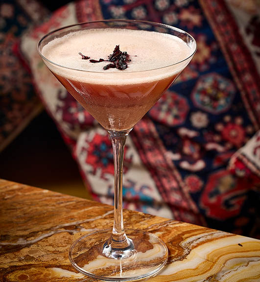 Hibiscus Gin, Pineapple Basil Shrub, Lime Citrus, Angostura Bitters, Orange Bitters